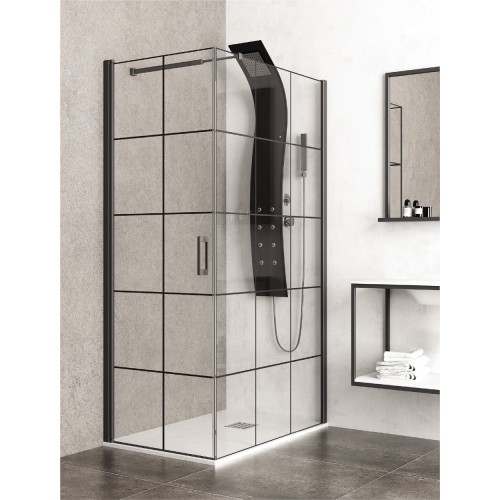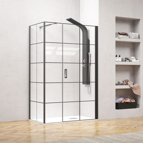 Γωνιακή Καμπίνα Μπάνιου Ανοιγόμενη Με Πλαϊνό Σταθερό Κρύσταλλο Nero 6 & Free 1 Nero | Κρύσταλλο Με Γραμμές 6mm - Black