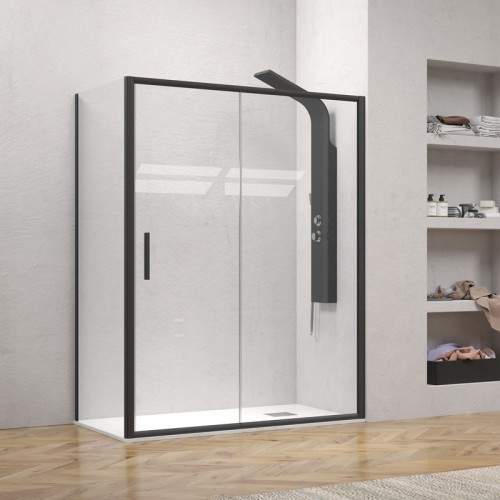 Γωνιακή Καμπίνα Μπάνιου Δίφυλλη Συρόμενη Με Πλαϊνό Σταθερό Κρύσταλλο Efe 500 Nero | Κρύσταλλο Διάφανο 5mm - Black